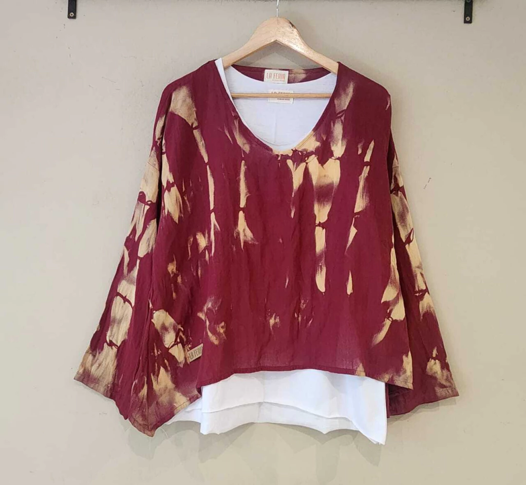 La parte superior de gasa rustica, teñida a mano.No hay una igual a la otra.