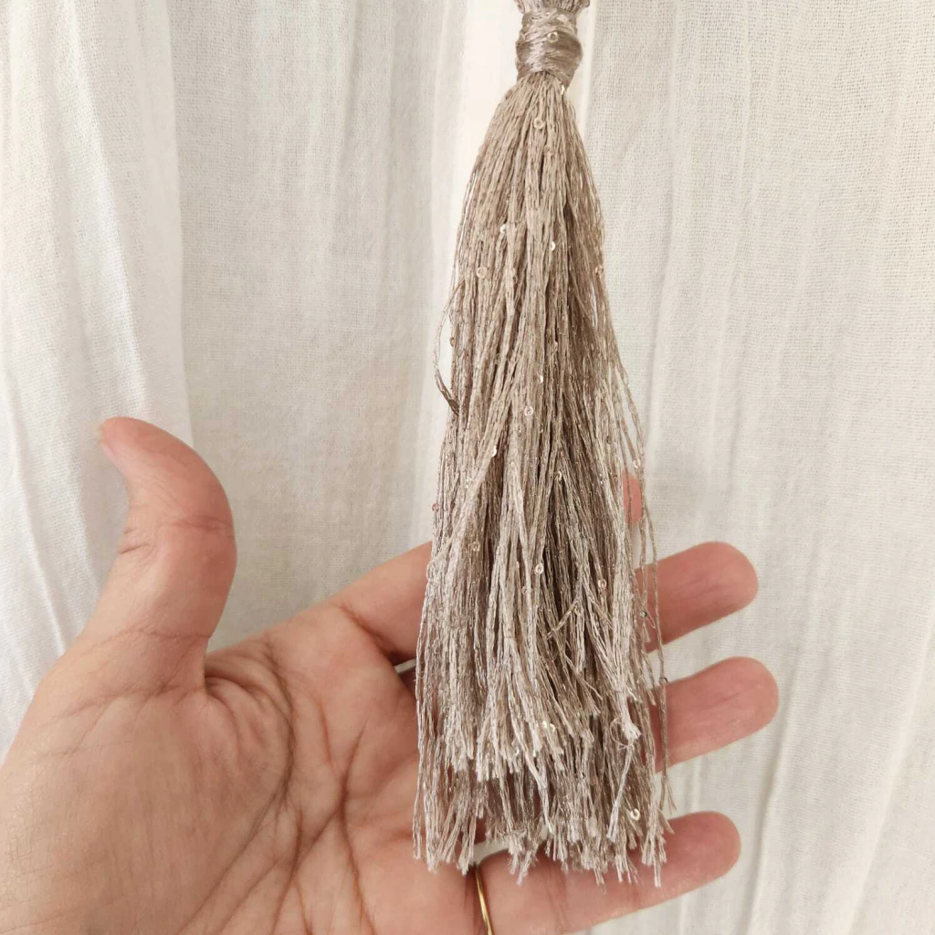 Collar conformado con cuentas de madera y una borla de hilo lurex hecho a mano.