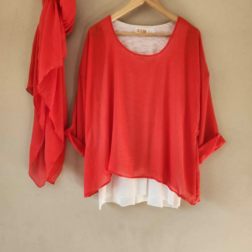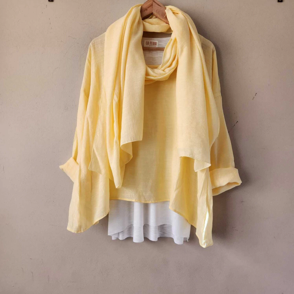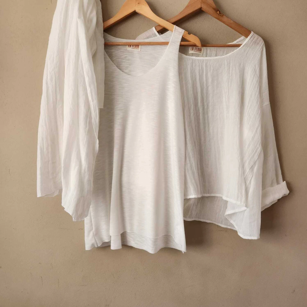 Conjunto compuesto por un chal y una camisola confeccionada en voile vintage, mas una musculosa de flame viscosa.