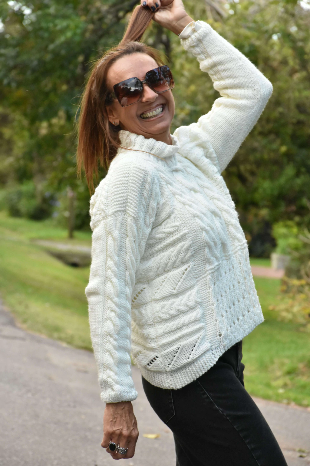 Sweater media polera confeccionado artesanalmente en un delicado tejido a dos agujas, que presenta distintos puntos y ochos que le aportan un toque distintivo. Ideal para cualquier ocasión, su diseño versátil permite combinarlo fácilmente con diferentes prendas.