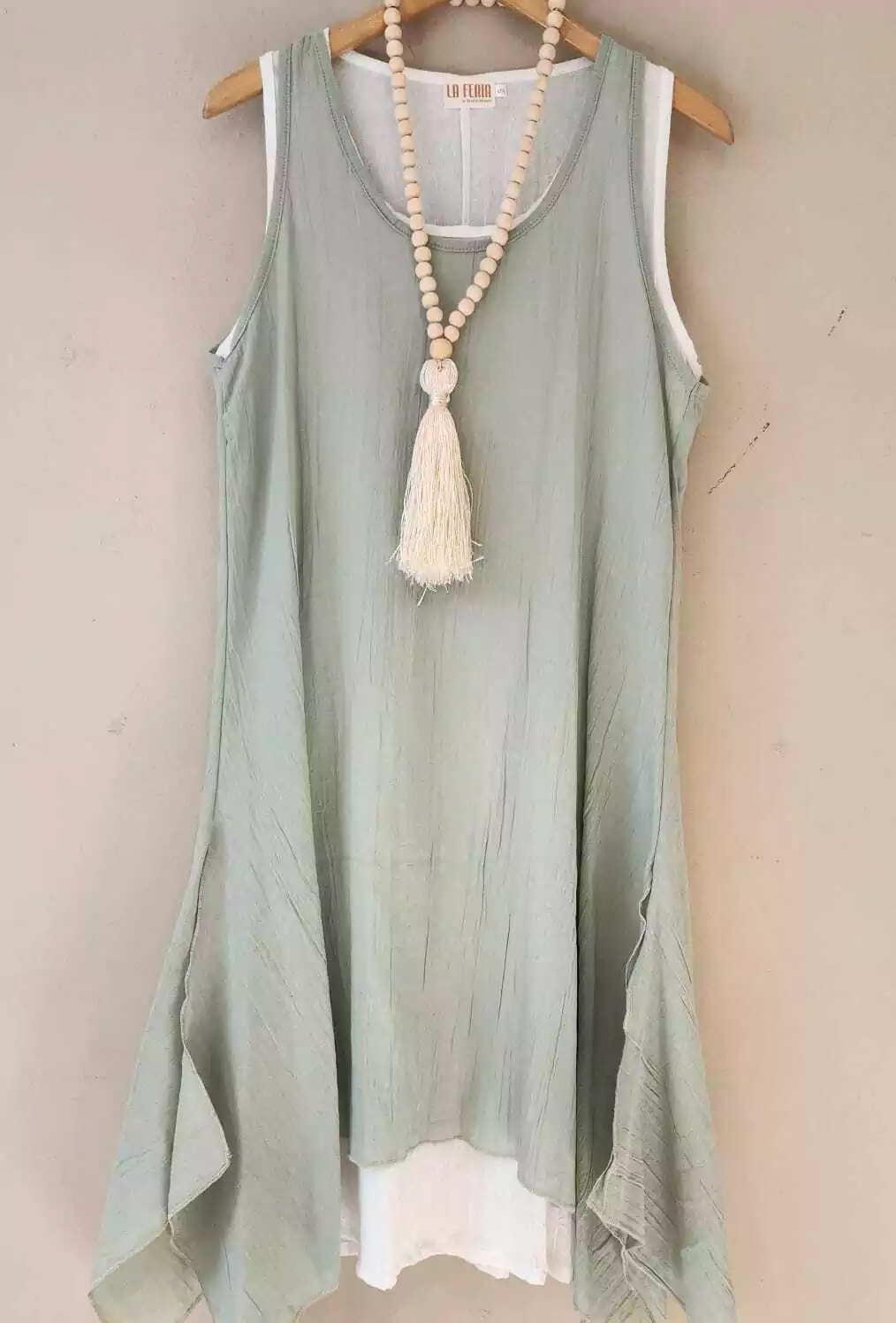 Vestido doble compusto por una enagua de gasa de algodon y una tunica de gasa de algodon.
